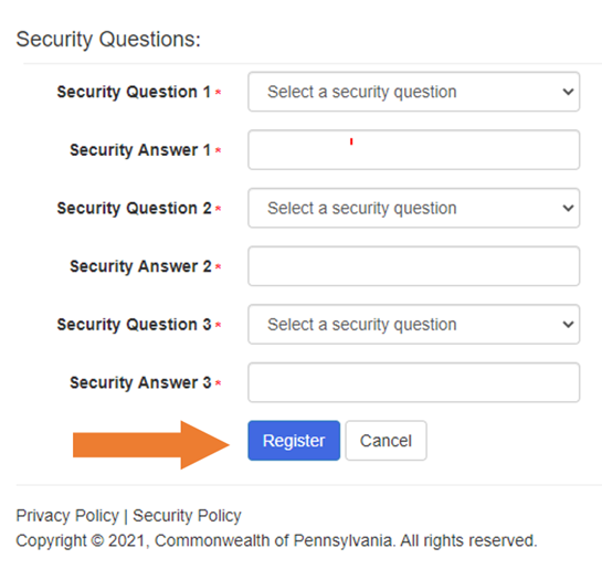 Security Questions: Select questions and provide answers. This will be used if you need to reset your password.
