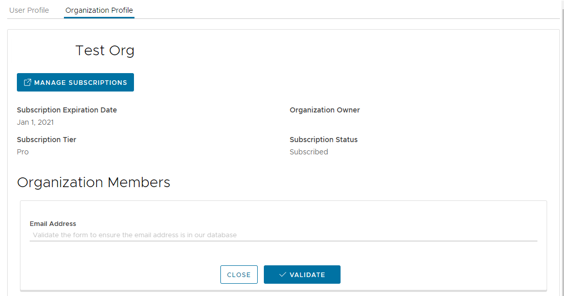 To add a user to the Organization, the Organization owner inputs a valid email address into the Search field and selects Verify before adding them, verifying that they are an active PA-SHARE user.