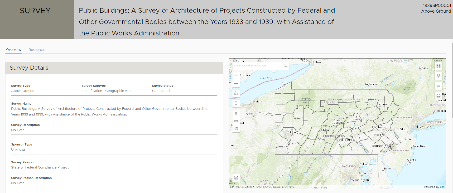 The Survey Detail screen displays information about architectural and archaeological surveys. Surveys provide information to SHPO reviewers and researchers about cultural resources throughout the Commonwealth of Pennsylvania. These are divided into two types: