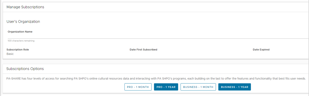 A paid account is not required to submit information to PA SHPO through PA-SHARE or to search and view the PA SHPO database. To learn more about the benefits of and the differences between the Pro and Business accounts, visit https://www.phmc.pa.gov/PA-SHARE/Pages/Options---Subscriptions.aspx.
