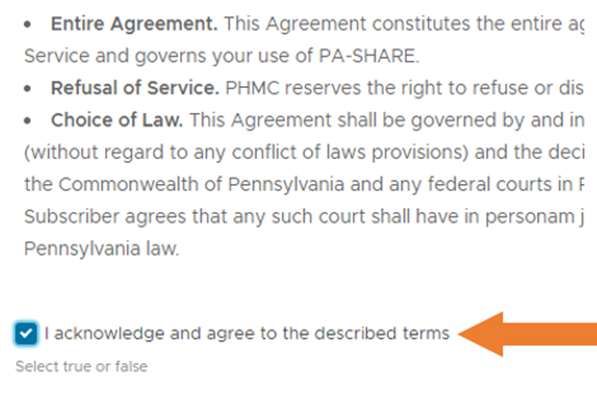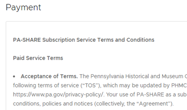 This window includes the full PA-SHARE Subscription Service Terms and Conditions/ Paid Service Terms.