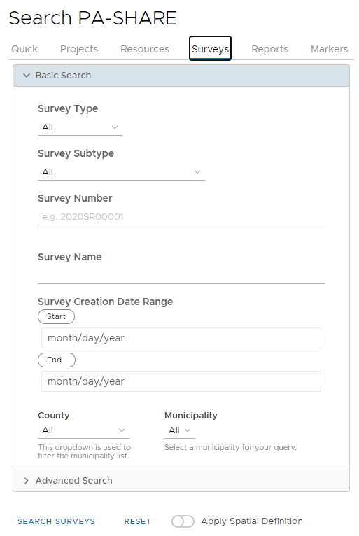 In Search, the Surveys tab provides basic search fields as shown below. You do not need to fill all of them. If you enter search terms in multiple fields, only results that exactly match all of your search terms will be returned. Letters can be upper or lower case. In text fields, partial search terms are acceptable.